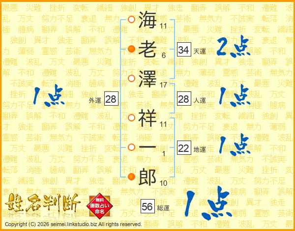 海(11画)老(6画)澤(17画) 祥(11画)一(1画)郎(10画)