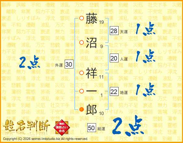 藤(19画)沼(9画) 祥(11画)一(1画)郎(10画)