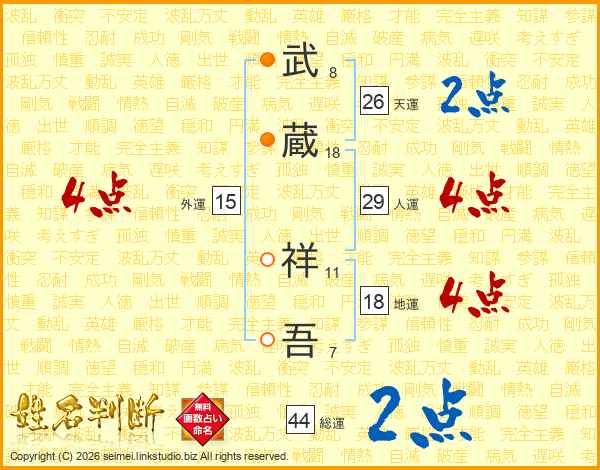 武(8画)蔵(18画) 祥(11画)吾(7画)