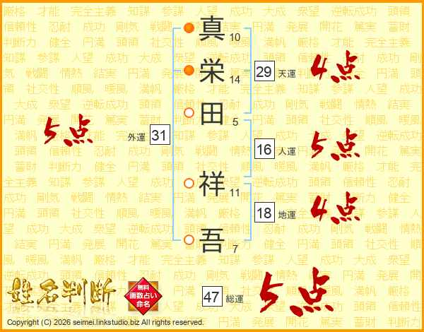 真(10画)栄(14画)田(5画) 祥(11画)吾(7画)