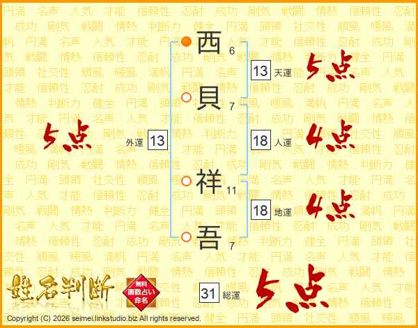 西貝祥吾さんの総運は31画の5点!