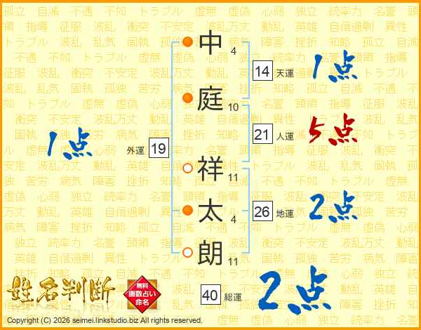 中(4画)庭(10画) 祥(11画)太(4画)朗(11画)