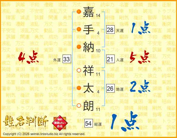 嘉(14画)手(4画)納(10画) 祥(11画)太(4画)朗(11画)
