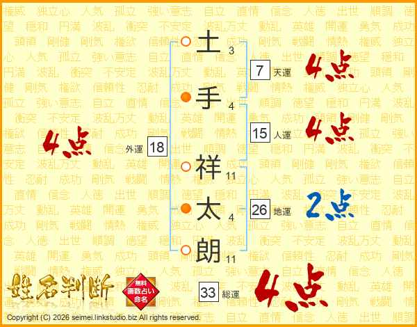 土(3画)手(4画) 祥(11画)太(4画)朗(11画)
