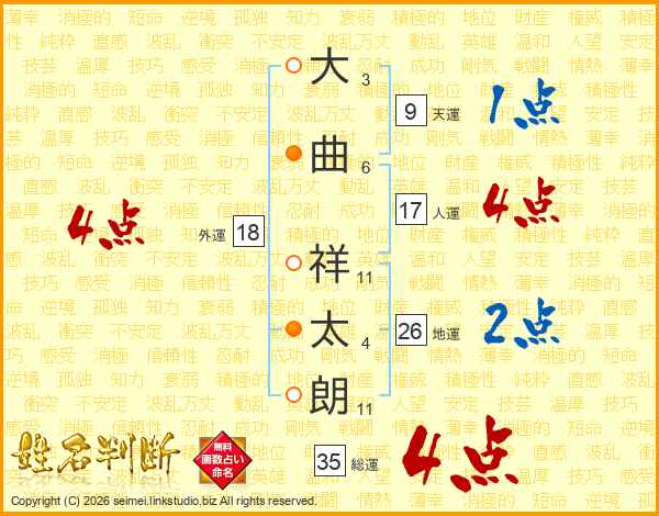 大(3画)曲(6画) 祥(11画)太(4画)朗(11画)