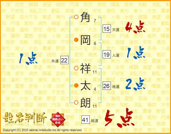 角(7画)岡(8画) 祥(11画)太(4画)朗(11画)