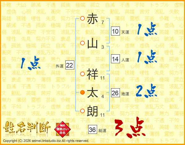 赤(7画)山(3画) 祥(11画)太(4画)朗(11画)