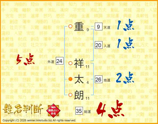 あなたの人生を表す1番重要な運勢です。生涯を通じて影響する総合運となり、主に50歳以降の晩年期に影響を及ぼします。苗字と名前の合計画数。