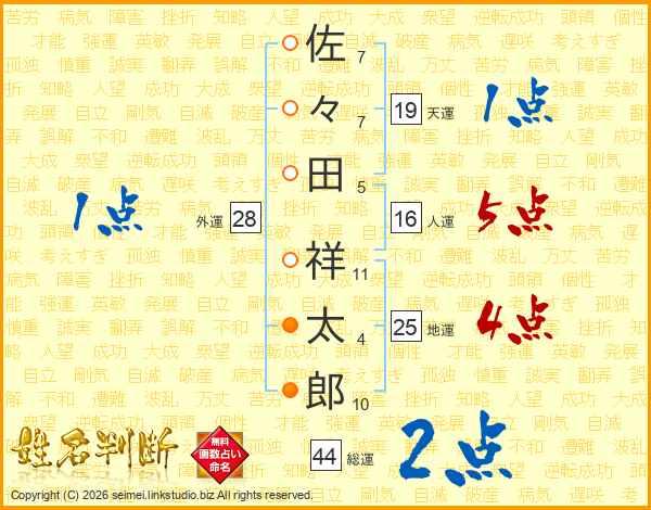 佐(7画)々(7画)田(5画) 祥(11画)太(4画)郎(10画)