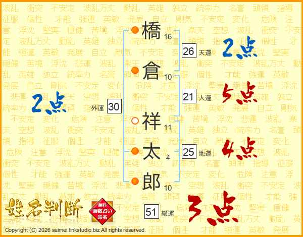 橋(16画)倉(10画) 祥(11画)太(4画)郎(10画)