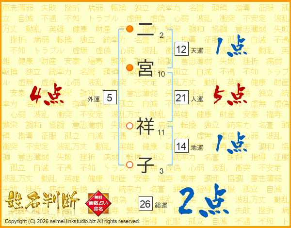 二宮祥子さんの総運は26画の2点!