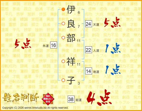 伊(6画)良(7画)部(11画) 祥(11画)子(3画)
