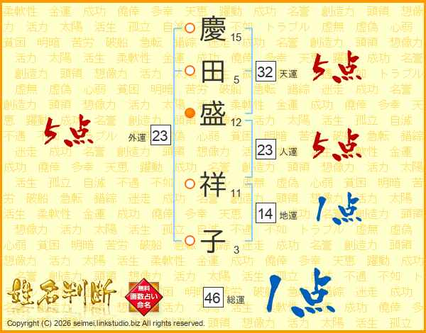 慶(15画)田(5画)盛(12画) 祥(11画)子(3画)