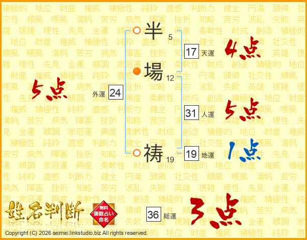 生活面を象徴する運勢です。外部から受ける影響力を表し、結婚運、家庭運や職場、環境への順応性を表します。総運から人運を引いた画数。姓や名が1文字の場合を除く。