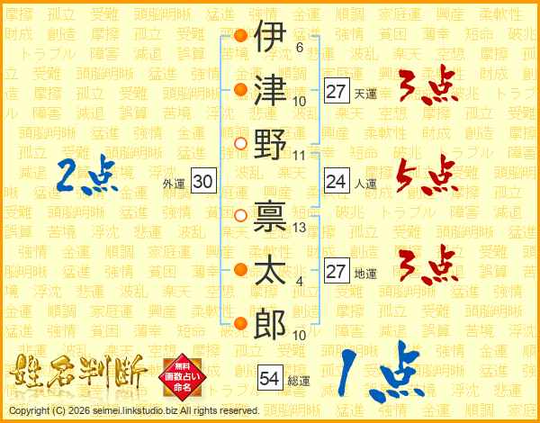 伊(6画)津(10画)野(11画) 禀(13画)太(4画)郎(10画)