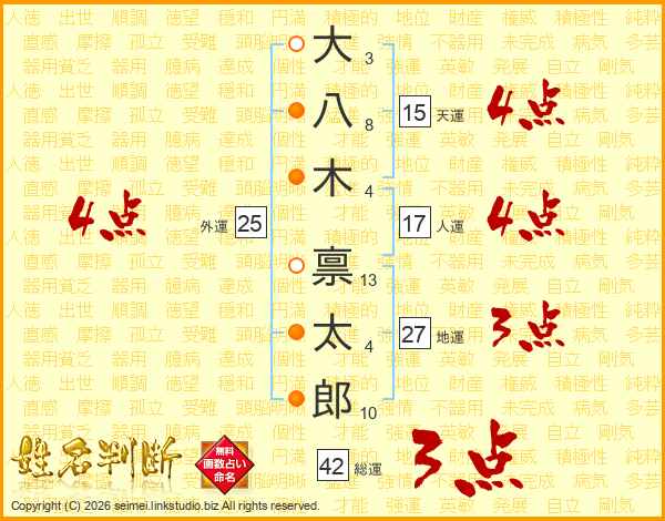大(3画)八(8画)木(4画) 禀(13画)太(4画)郎(10画)