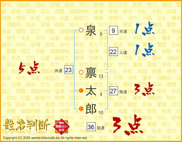 泉(9画) 禀(13画)太(4画)郎(10画)