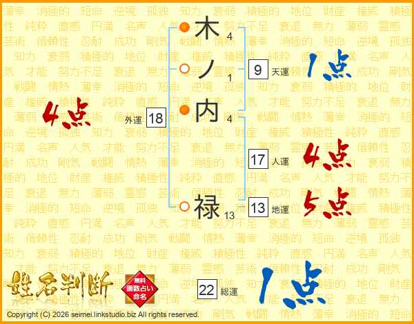 木(4画)ノ(1画)内(4画) 禄(13画)