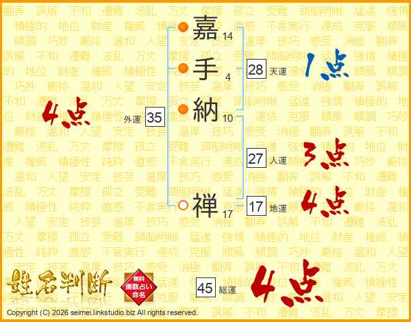 嘉(14画)手(4画)納(10画) 禅(17画)