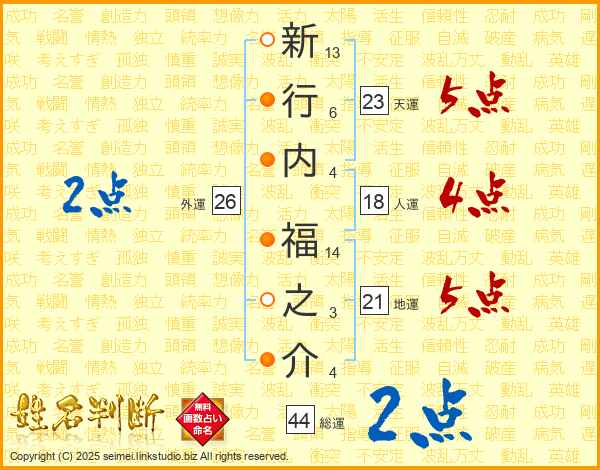 生活面を象徴する運勢です。外部から受ける影響力を表し、結婚運、家庭運や職場、環境への順応性を表します。総運から人運を引いた画数。姓や名が1文字の場合を除く。