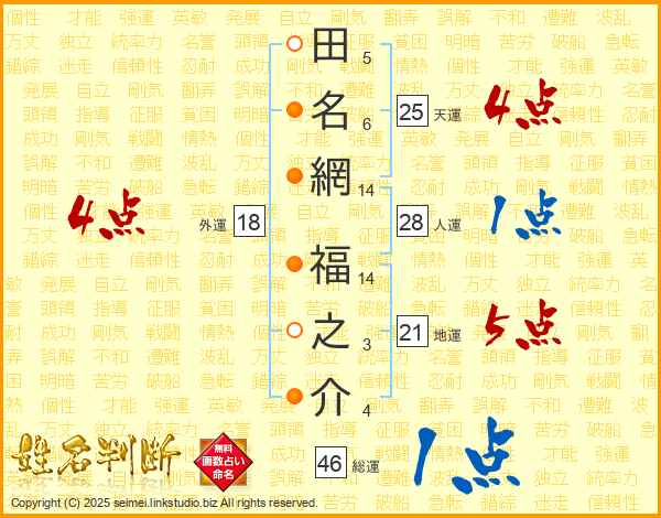 田(5画)名(6画)網(14画) 福(14画)之(3画)介(4画)