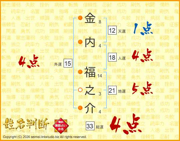 金(8画)内(4画) 福(14画)之(3画)介(4画)