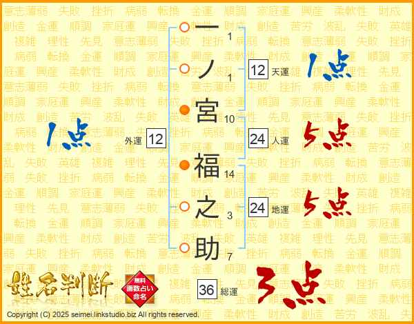 一(1画)ノ(1画)宮(10画) 福(14画)之(3画)助(7画)