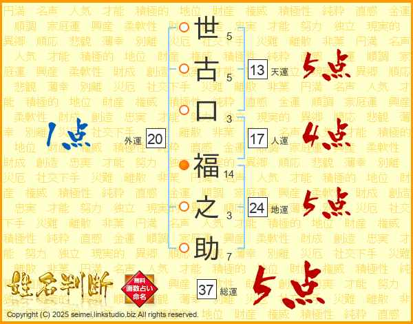 世(5画)古(5画)口(3画) 福(14画)之(3画)助(7画)