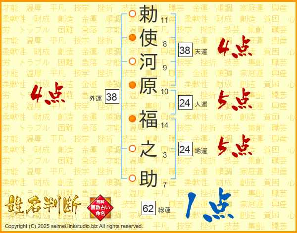 勅(11画)使(8画)河(9画)原(10画) 福(14画)之(3画)助(7画)