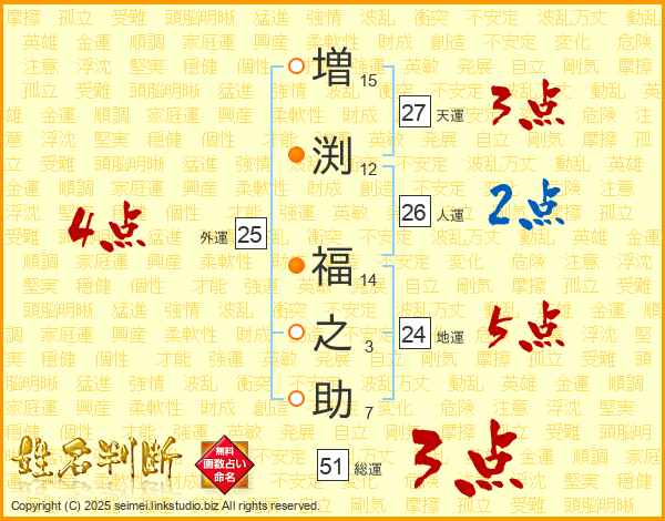 増(15画)渕(12画) 福(14画)之(3画)助(7画)