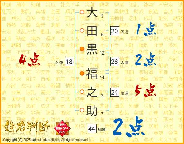 大(3画)田(5画)黒(12画) 福(14画)之(3画)助(7画)