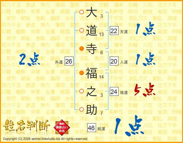大(3画)道(13画)寺(6画) 福(14画)之(3画)助(7画)