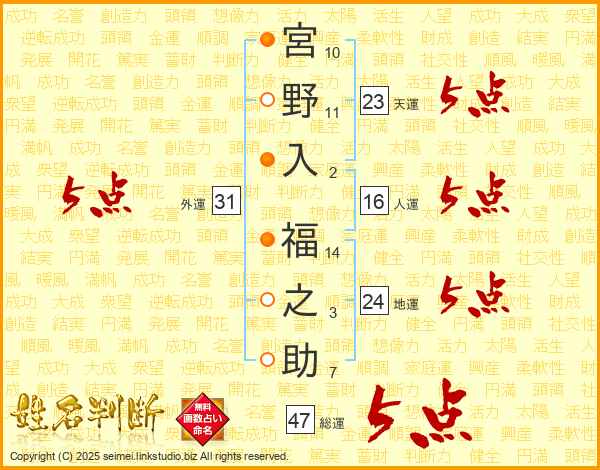 宮(10画)野(11画)入(2画) 福(14画)之(3画)助(7画)