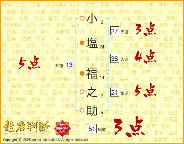 小(3画)塩(24画) 福(14画)之(3画)助(7画)