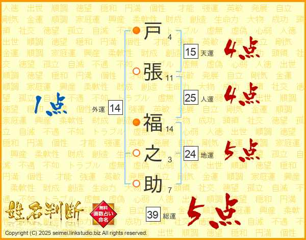 戸(4画)張(11画) 福(14画)之(3画)助(7画)
