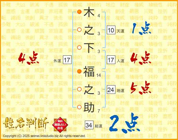 木(4画)之(3画)下(3画) 福(14画)之(3画)助(7画)