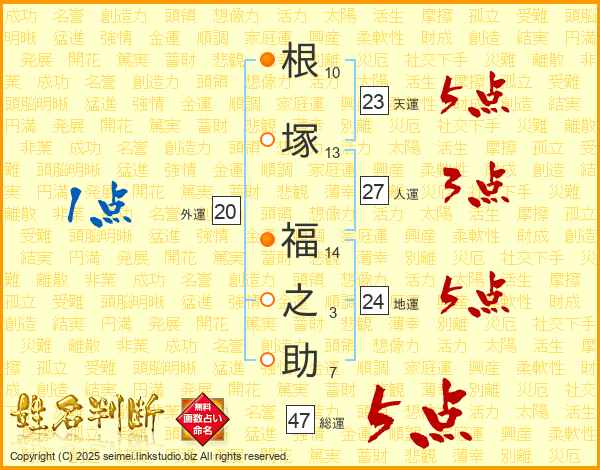 根(10画)塚(13画) 福(14画)之(3画)助(7画)