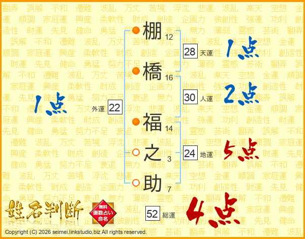 棚(12画)橋(16画) 福(14画)之(3画)助(7画)