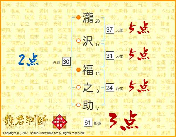瀧(20画)沢(17画) 福(14画)之(3画)助(7画)