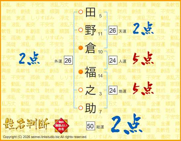 田(5画)野(11画)倉(10画) 福(14画)之(3画)助(7画)