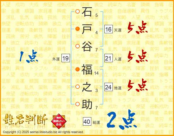 石(5画)戸(4画)谷(7画) 福(14画)之(3画)助(7画)