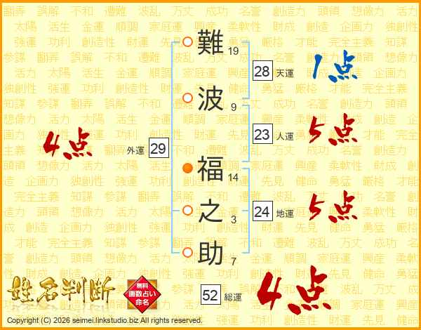 難(19画)波(9画) 福(14画)之(3画)助(7画)