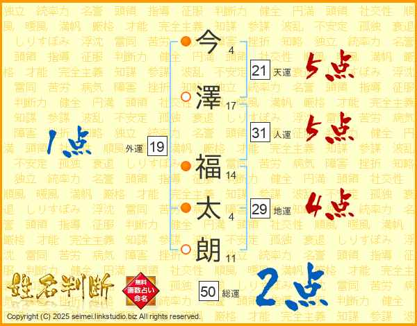 今(4画)澤(17画) 福(14画)太(4画)朗(11画)