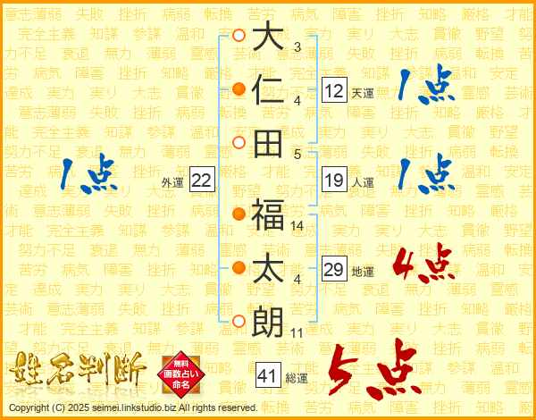 大(3画)仁(4画)田(5画) 福(14画)太(4画)朗(11画)