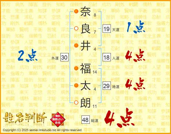奈(8画)良(7画)井(4画) 福(14画)太(4画)朗(11画)