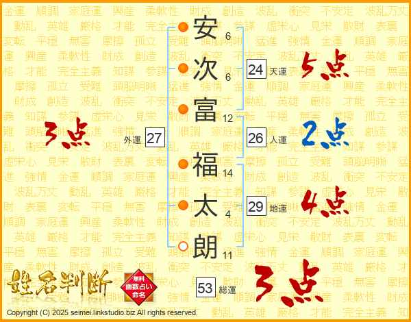 安(6画)次(6画)富(12画) 福(14画)太(4画)朗(11画)