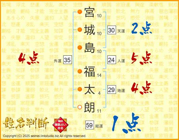 宮(10画)城(10画)島(10画) 福(14画)太(4画)朗(11画)