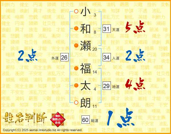 小(3画)和(8画)瀬(20画) 福(14画)太(4画)朗(11画)