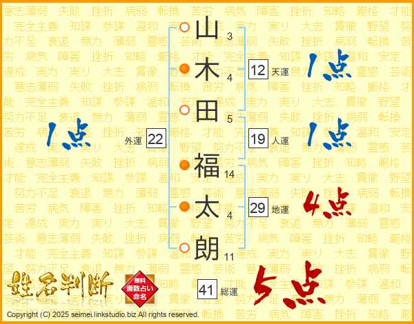 山(3画)木(4画)田(5画) 福(14画)太(4画)朗(11画)
