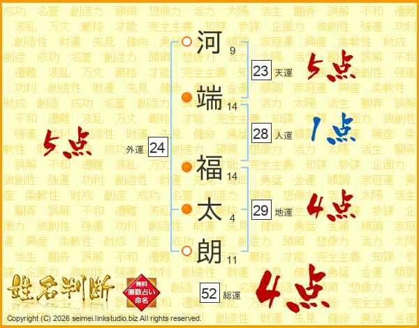河(9画)端(14画) 福(14画)太(4画)朗(11画)